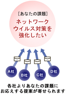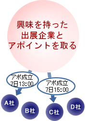 | さらに具体的な課題についてやり取りし、興味を持った出展企業と展示会場でのアポイントを事前に取ります。 | |||||||||